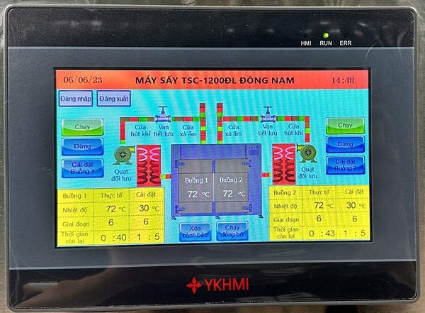 - Màn hình cảm ứng: được kỹ thuật Đông Nam lập trình 6 giai đoạn sấy, quý khách chỉ cần nhập nhiệt độ và thời gian, máy sẽ tự động khởi chạy lần lượt theo giai đoạn và tự động ngắt máy, làm mát động cơ khi hết thời gian.