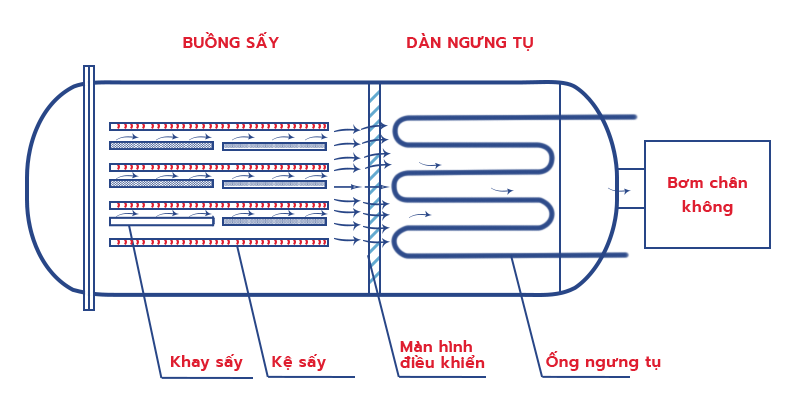 - Hơi nước sau khi sấy thăng hoa được thu hồi tại bộ phận bẫy nước để hơi nước giúp không quay trở lại buồng sấy, quá trình sấy diễn ra nhanh hơn.