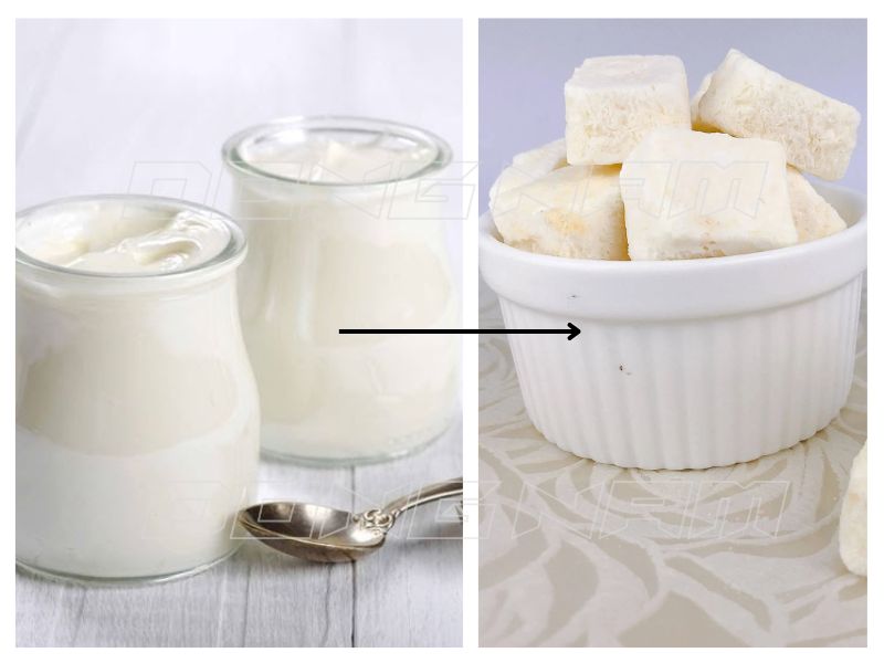 Ở công đoạn này, sữa chua sẽ tiến hành sấy khô qua 2 giai đoạn: cấp đông và sấy thăng hoa.